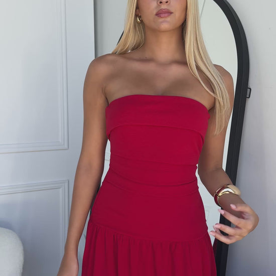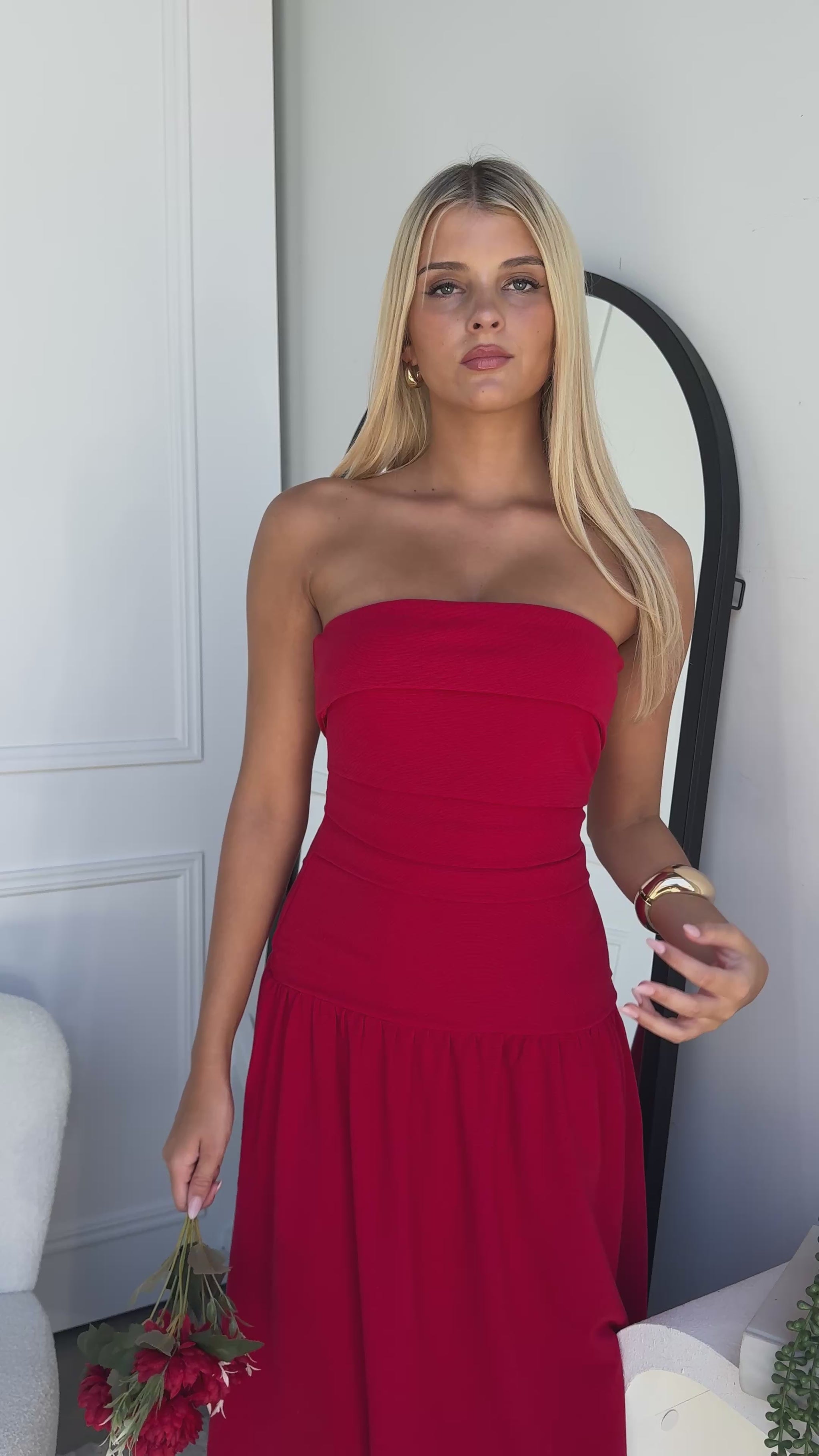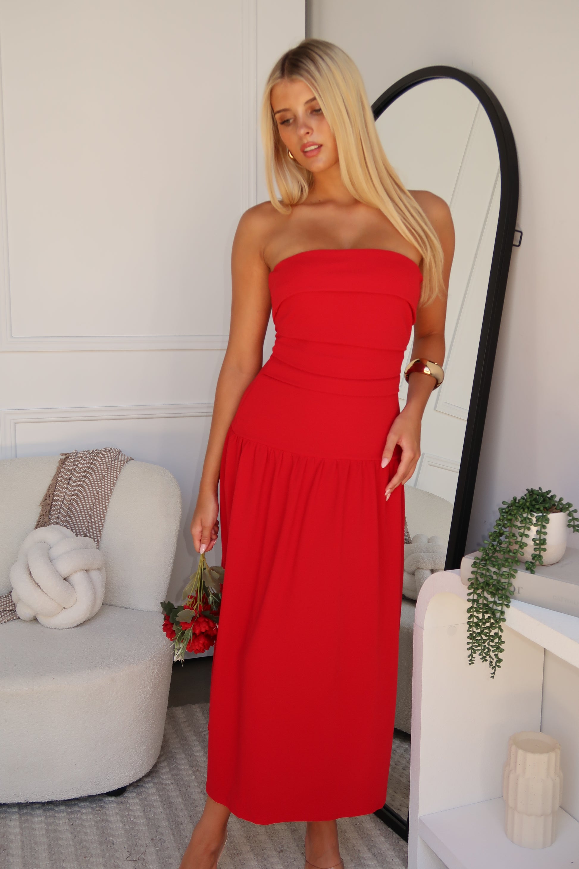 Make an unforgettable statement in our Red Strapless Maxi Dress, designed to turn heads from every angle. Featuring a structured, fitted bodice that hugs the figure and a dropped waist that flows effortlessly into an elegant A-line skirt, this silhouette creates a beautifully balanced and flattering shape. The bold red hue evokes confidence and romance, while the strapless neckline highlights the décolletage for a timeless, feminine finish. Finished with a delicate rose symbol detail, this maxi dress is the ultimate choice for date nights, Valentine’s Day, or any occasion that calls for effortless allure.