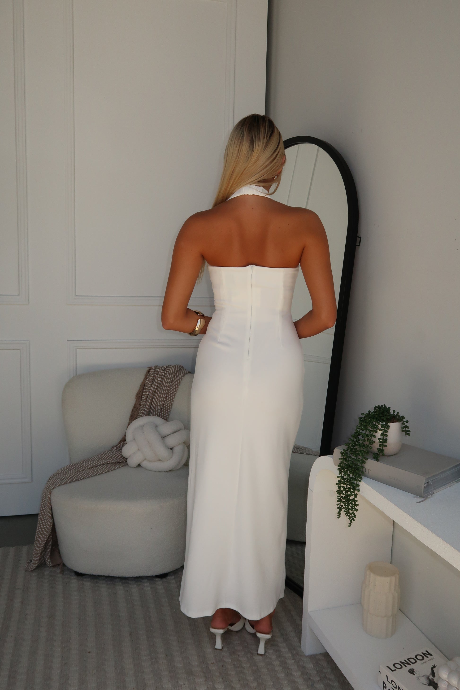 Cut from luxe, thick white crepe, our Jemma halter maxi dress is designed to sculpt and define. A streamlined, body-skimming silhouette is enhanced with artful ruching through the bodice, creating soft texture against a structured foundation. Minimal yet striking, the elongated form falls effortlessly to the floor, delivering a modern expression of understated elegance.