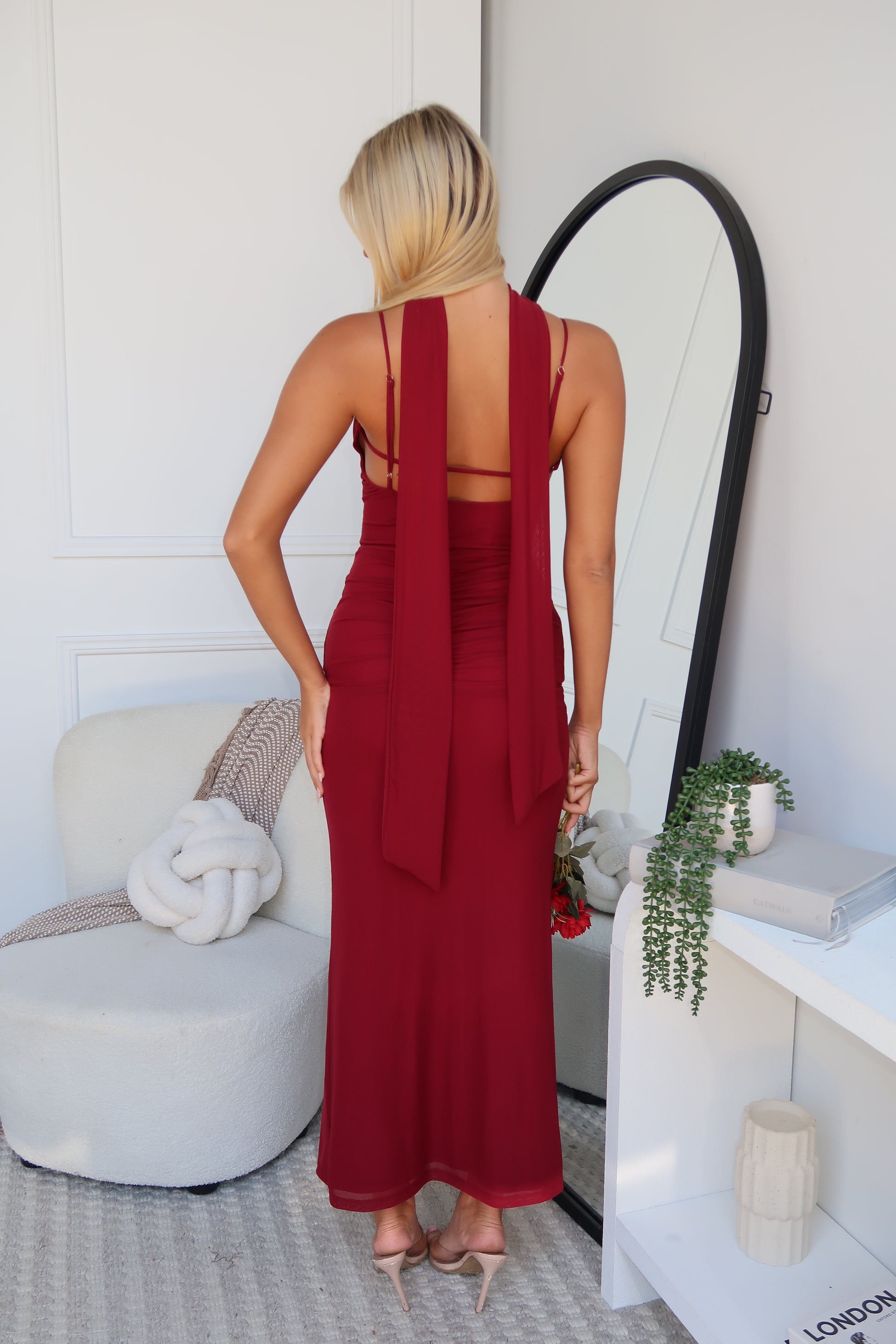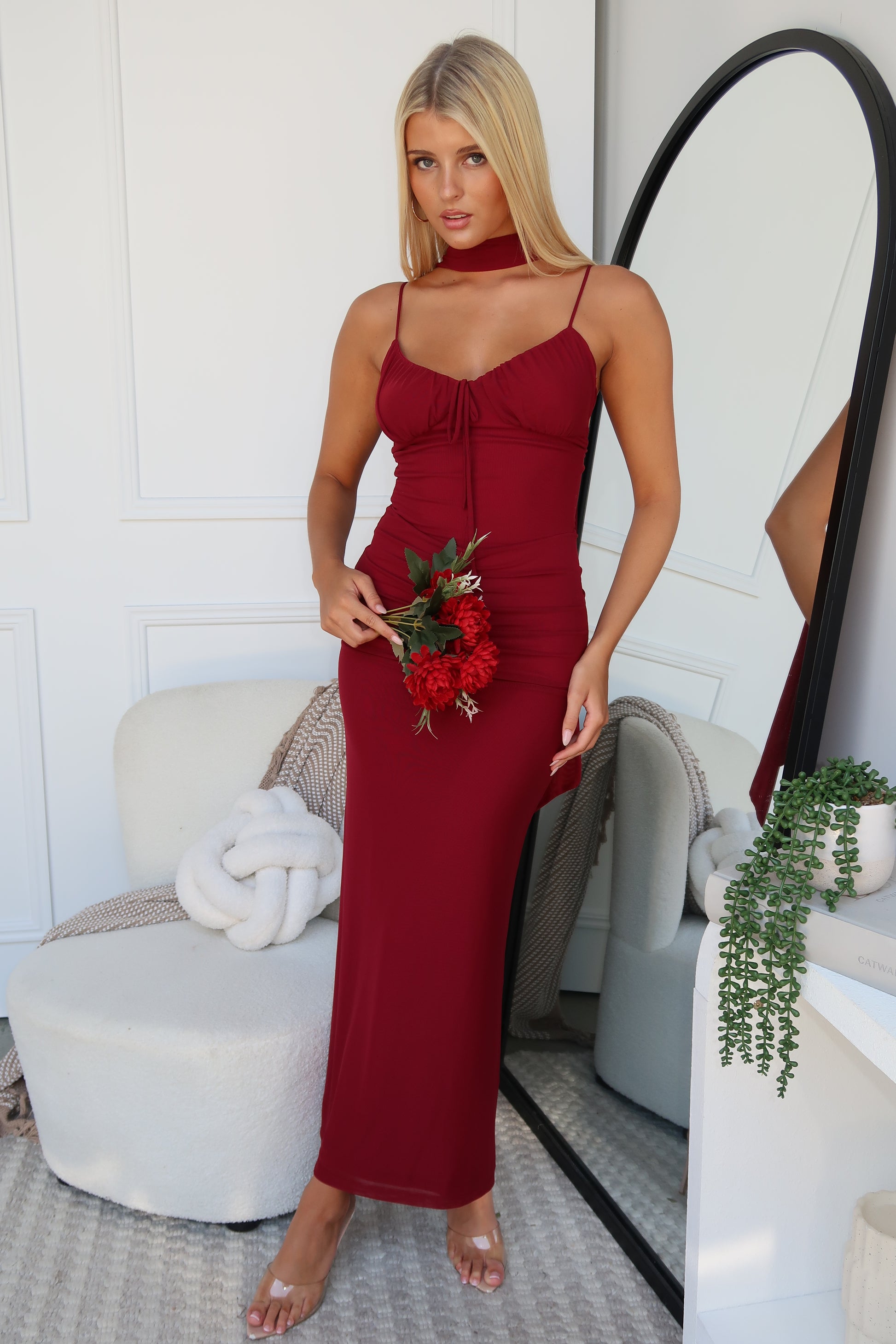 This wine-hued beauty is designed to turn heads, featuring a removable neck sash so you can style it your way. Crafted to hug in all the right places, it flatters the figure with a sleek, confident silhouette while still feeling effortlessly wearable. Romantic, timeless, and undeniably chic — this is the maxi you’ll reach for when you want to feel your absolute best.