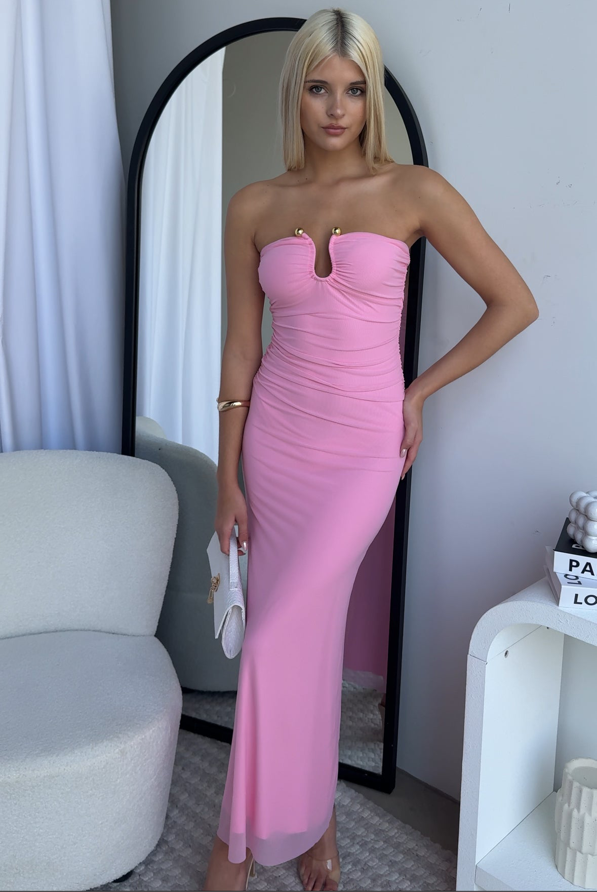 Turn heads in the Kirra strapless maxi dress. This devine strapless maxi with gold hardware detail is the perfect style for your next special occasion. Curated from stretch mesh fabric making it comfortable, flattering and easy to wear. Pair with your fave gold jewellery and nude heels for the look to kill!