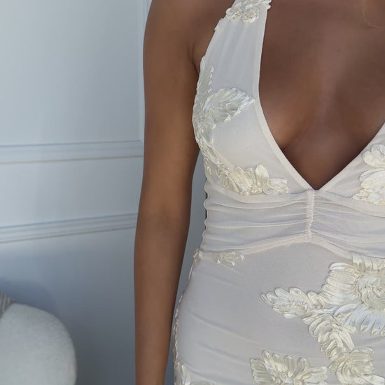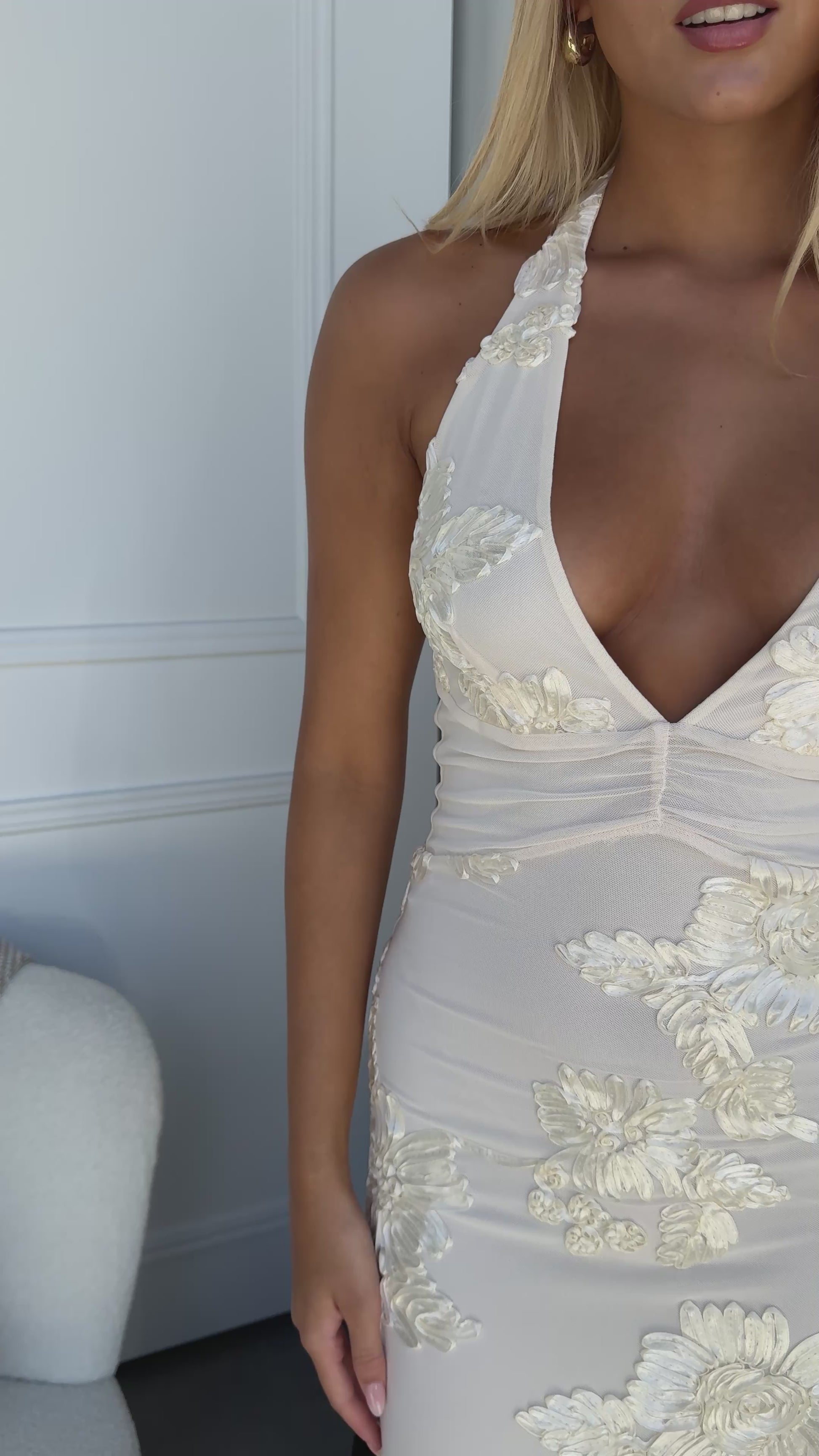 The Lorita Maxi is made to stand out. The most stunning halter neck line, embroidered floral fabric and waist detail. Wear to your next wedding, cocktail party or fancy dinner!