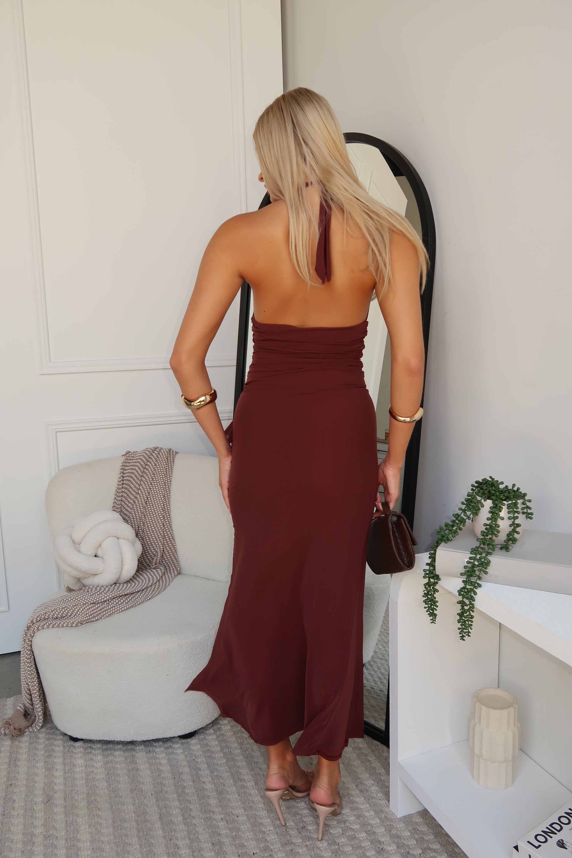 Effortlessly elegant and endlessly flattering — this chocolate-toned halter dress is the ultimate statement piece. Featuring a soft cowl neckline that drapes beautifully across the bust and a halter tie design that highlights the shoulders, it strikes the perfect balance between sophistication and allure. The rich chocolate hue adds a touch of luxury, while the feminine ruffle detailing flows gracefully with every step. Style it with gold jewellery and strappy heels for a warm, elevated glow that’s perfect for evening events, date nights, or cocktail parties.