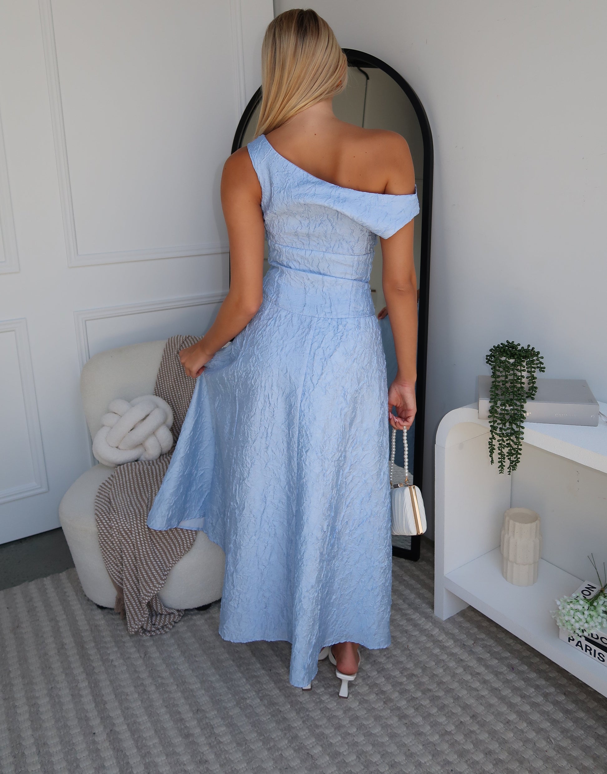 Make a statement in the Tyra asymmetrical One Shoulder Maxi Dress in Blue. Pair it with a loose, textured bun and a silver hair clip for a polished yet relaxed vibe. Add strappy silver heels, a delicate bracelet, and a sleek clutch for a sophisticated, evening-ready look. This gorgeous dress features textured fabric, a line skirt and a off shoulder neck line.